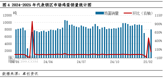 节后鸡蛋需求恢复不及预期:销区鸡蛋销量是衡量鸡蛋需求的主要指标。节后虽然企业开工水平逐步提升,学生开学等导致需求增加,但企业订单量不大,总体需求恢复速度较慢,导致鸡蛋销量不及预期。根据卓创资讯监测数据显示,2月鸡蛋周度销区销量呈增加趋势,但周均销量较1月平均水平跌幅接近4.00%,市场需求跟进不足,对价格产生利空影响。