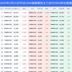 新浪期货 根据交易所数据,截至2月21日收盘主力合约中证1000指数期货2503,涨跌+2.10%,成交量20.11万手,持仓数据显示前20席位呈现净空,差额头寸为14991手。