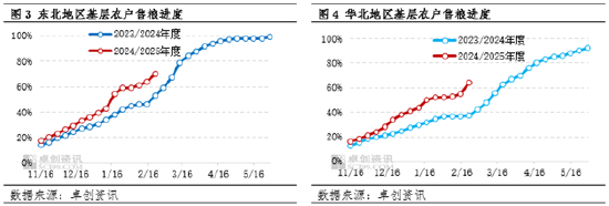 基层售粮进度偏快。因2024/2025季玉米产量较去年减少1110万吨,同时部分地区玉米上市时间提前,新季玉米上市以来,基层农户持续售粮,本季玉米售粮进度持续快于去年同期。截至2月20日,华北地区基层农户售粮进度为64%,较去年同期快26个百分点;东北地区基层农户售粮进度为69%,较去年同期快16个百分点。春节过后,受玉米价格持续上涨影响,同时部分地区基层余粮偏少,农户售粮积极性欠佳,售粮相对有限。随着价格逐步涨至部分业者心理预期,农户售粮积极性提升,但因贸易环节建库需求持续存在,玉米市场有供应较往年同期略偏紧。