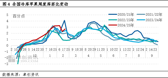 第三,产地库存低于往年同期,西北果农货消化进度较快。从产地冷库剩余库存量来看,明显低于往年同期。截止到2月20日,全国冷库苹果剩余量553.32万吨,去库存率约为34.16%,同比2024年低114.93万吨,幅度17.20%。甘肃产区出货进度明显优于其他产区,据统计甘肃产区冷库剩余货源库容比38.52%,出库进度约为58.79%。西北产区冷库中果农货剩余占比已经较少,客商采购的难度与春节前相比有所增加。