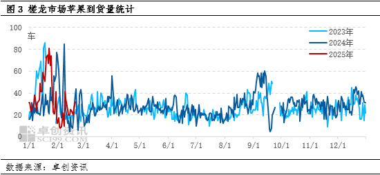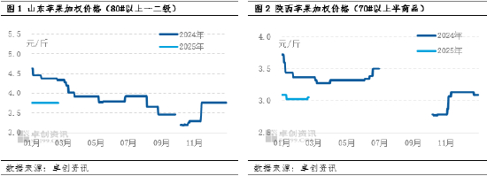 2025年春节过后,产地苹果行情较好,部分规格货源出现上涨,东西部产区存在一定行情差异,综合来看,西北产区价格上涨更明显。甘肃产区冷库调货价格出现上涨,75#以上果农货主流成交价格从3.0-3.2元/斤上涨至3.4-3.6元/斤,累计涨幅达到12.9%。陕西产区冷库成交价格较春节之前也有小幅上涨,洛川70#以上果农货主流成交价格从3.0-3.2元/斤,上浮至3.2-3.4元/斤,涨幅6.45%。山东产区不同规格表现差异明显,一二级货源成交仍旧比较少,出货量不大,仅有意向报价,未见明显变动;统货价格出现上涨,栖霞地区80#以上果农统货价格从2.2-2.3元/斤上涨至2.5-2.6元/斤,涨幅13.33%。