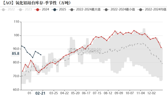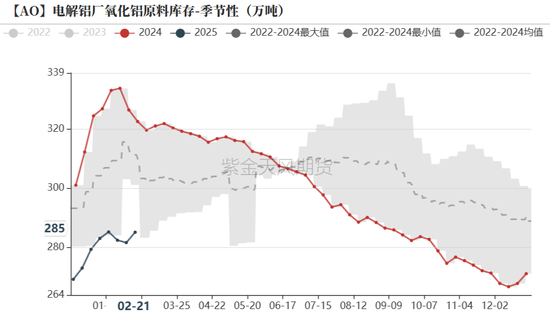 春节假期阶段性影响库存。电解铝厂原料库存为285.2万吨,较前一周增加3.5万吨。站台/在途库存为85.8万吨,较前一周减少1.3万吨。氧化铝厂厂袋库存为9.0万吨,较前一周减少1.0万吨。春节期间站台相对积压,下游厂商氧化铝到货减少。随着汽运恢复,站台库存逐渐消化;原料库存恢复累积。