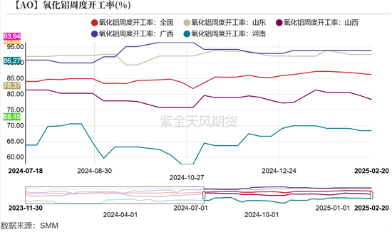 周度开工率方面,上周氧化铝全国开工率环比下调0.34%至86.27%。当前行业高利润状态仍处相对高位,企业高产、满产的意愿强烈。具体而言,山东地区开工率为92.66%,较前一周暂无变动;山西地区开工率为78.37%,较前一周减少1.20%;广西地区开工率为93.94%,较前一周暂无变动;河南地区开工率为68.45%,较前一周减少0.72%。