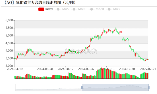 上周氧化铝主力合约期货价格窄幅震荡。具体而言,氧化铝主力合约在上周一开盘于3346元/吨,在上周五收盘于3428元/吨,周内跌幅为-0.03%,波幅为0.49%;周内最高点为3479元/吨,最低点为3344元/吨。