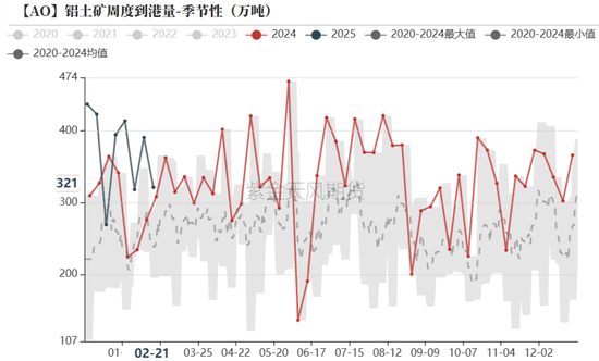 进口铝土矿方面,截至上周五,几内亚进口矿石平均价格为95美元/吨,较前一周下降2美元/吨,澳大利亚进口矿石平均价格为95美元/吨,较前一周上升13美元/吨。