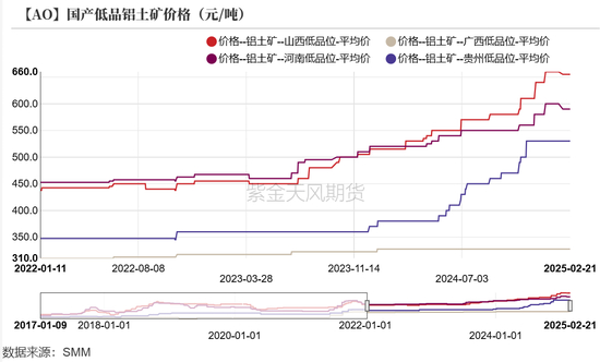 低品矿方面,山西地区低品矿石为640元/吨;河南地区低品矿石为600元/吨;广西地区低品矿石为327.5元/吨;贵州地区低品矿石为530元/吨。