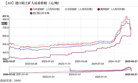 结合汇率小幅波动,几内亚进口铝土矿折算人民币价格为692.55元/吨,澳大利亚进口铝土矿折算人民币价格为692.55元/吨。