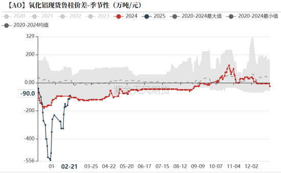 区域价差趋于修复。具体而言,截至上周五,氧化铝山西-山东现货价差为0元/吨。山东-广西价差为-90元/吨,均已落入常态区域。