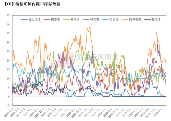 上周,中国16港口进口铜精矿当周库存为80.4万吨,较上周环比减5.4万吨。(原口径:中国7个主流港口进口铜精矿当周库存为59.1万吨,较上周环比减4.0万吨)分港口来看,南京港、青岛港出现明显下降,锦州港及防城港港出现增加。