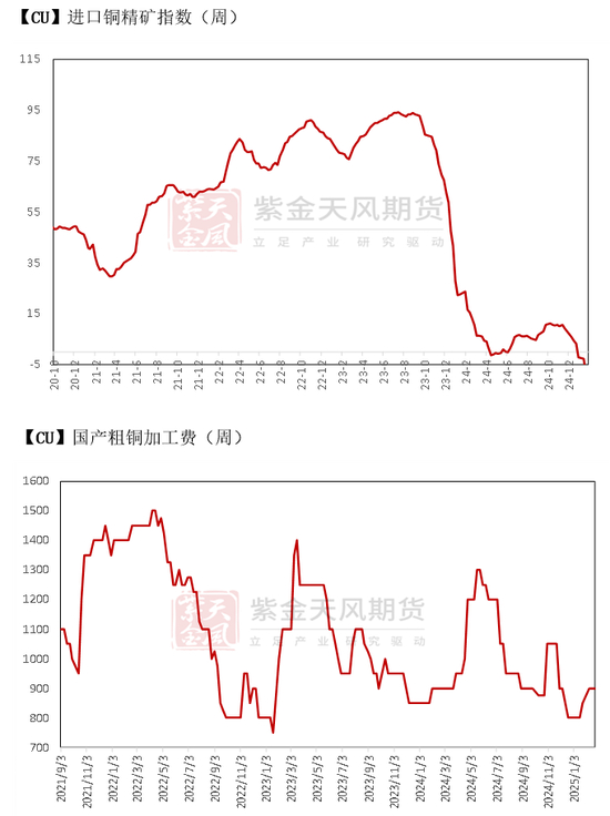 上周,铜价高位盘整,金银价格强势,但TC价格持续刷新历史低位,炼厂长单零单亏损状态进一步扩大,长单亏损约600元/吨左右,零单亏损约在1600元/吨左右。随着铜矿吃紧,国内部分冶炼厂原料出现紧缺,随着TC价格进一步走跌,预计粗铜加工费也将出现吃紧。考虑时间周期,从2季度中开始,国内供应存在变数。