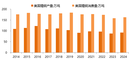 美国2020-2024年均精铜产量93万吨,占全球产量的比重约3.3%;同期年均消费170万吨,占全球消费比重的6.2%,是全球比较重要的消费国。美国年度产销缺口约77万吨(平均每月需进口精铜约7万吨)。智利是美国最大的铜进口来源国,占进口总量的38%,其次是加拿大和墨西哥,分别占28%和8%。