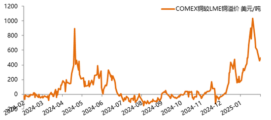 2月中旬对进口铜加征关税导致美国COMEX铜一度比伦敦金属交易所的同等合约溢价1200美元/吨,之后回落400-500美元/吨。不过当地时间2月25日晚特朗普宣布对铜展开调查,COMEX铜盘中大幅上涨超3%,COMEX铜溢价再度攀升至高位。
