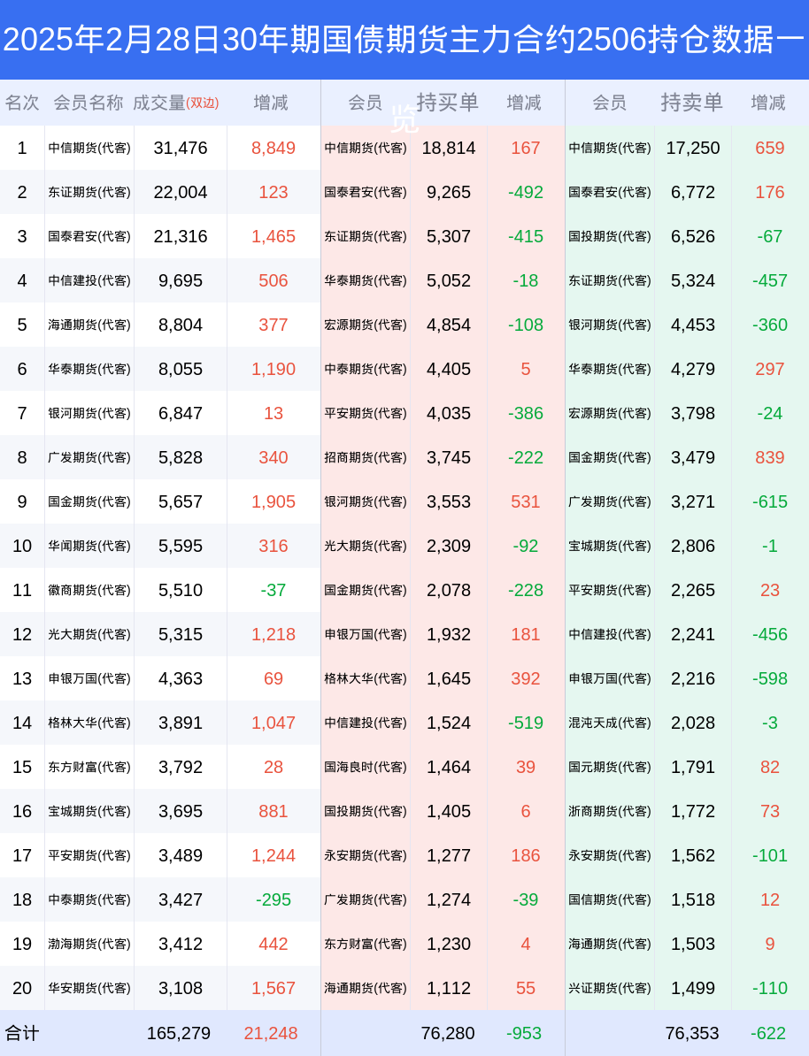 根据合并数据显示,多头前三席位为中信期货(代客),总持仓18814、国泰君安(代客),总持仓9265、平安期货(代客),总持仓7782;空头前三席位为中信期货(代客),总持仓19045、国泰君安(代客),总持仓6772、国投期货(代客),总持仓6526;