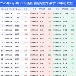 新浪期货 根据交易所数据,截至2月28日收盘主力合约30年期国债期货2506,涨跌+0.54%,成交量11.96万手,持仓数据显示前20席位呈现净空,差额头寸为73手。