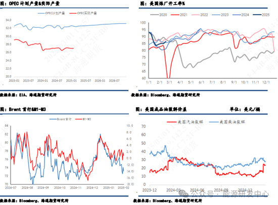 2月份原油市场基本面随着时间推移有小幅改善的迹象,供应端来看,OPEC+有维持减产的意向,部分成员国主动减产,如尼日利亚、阿联酋等,显示出 OPEC+维持供应纪律的决心,在一定程度上限制了全球原油供应,避免价格因供应过剩而大幅下滑。数位OPEC+的代表也表示对石油需求增长放缓、美洲地区供应增加以及特朗普政府的关税政策带来的风险表示担忧。目前原油市场的预测OPEC+仍会继续推迟4 月开始的逐月增产计划。需求端来看,随着北半球冬季取暖需求高峰临近尾声,炼厂检修季结束后开工率提升,炼厂原油投料增加,对油价形成阶段性支撑。同时,EIA、IEA 以及 OPEC三大月报均上调了今年的全球原油需求增量,说明对全年原油需求有一定的信心,尽管增速有所放缓,但需求的增长预期对市场仍然有积极作用。从库存来看,美国原油商业库存在连续多周累库后,在本周出现库存超预期下降,也视为利好信号。从高频的月差以及裂解价差来看,都没有明显下行甚至有上升趋势,为油价底部带来支撑。