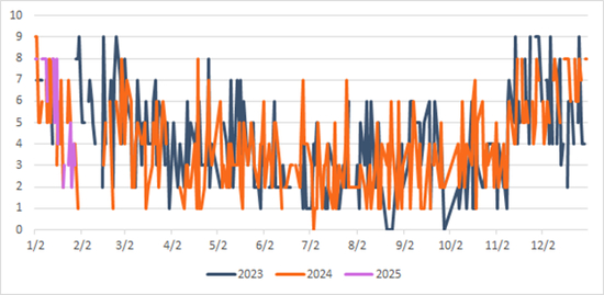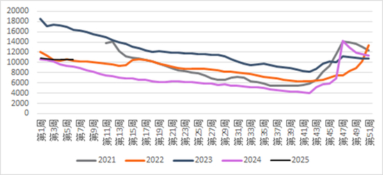 库存高企,去库承压。截至2025年2月27日,我的农产品调研数据统计36家样本点物理库存在10990吨,环比增加3.85%,同比增加22.48%。本周样本点库存增加,一方面是内地客商返疆采购原料和等外品,另一方面沧州市场囤货群体采购现货入库,库容紧张带动冷库费用上涨。从余货数量来看,较往年相比处于中等偏上水平,库存结构方面,从未加工货源来看等外占比仍较多,大级别好货供应偏紧价格稳硬,同等级价差扩大,好货与一般货的价格分化进一步显著。持货商对于高品质货源表现出较强的挺价惜售意愿,而一般货余货较多的客商则顺价出货意愿明显。