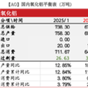 氧化铝持续累库。截至上周五,氧化铝总库存(即厂内、在途、原料、港口库存总和)为385.9万吨,较前一周增加1.3万吨。