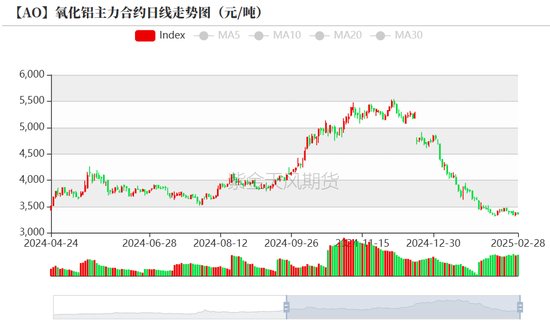 上周氧化铝主力合约期货价格窄幅震荡。具体而言,氧化铝主力合约在上周一开盘于3410元/吨,在上周五收盘于3363元/吨,周内跌幅为-1.38%,波幅为0.21%;周内最高点为3428元/吨,最低点为33223元/吨。