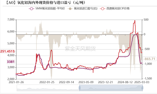 氧化铝进口盈亏:偏空 上周氧化铝进口盈亏为-865.71元/吨,内外价差收窄,但进口窗口仍处于关闭状态。