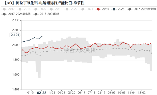 “氧化铝-电解铝运行产能比值”持续回升。截止上周五,回升至2.1211。