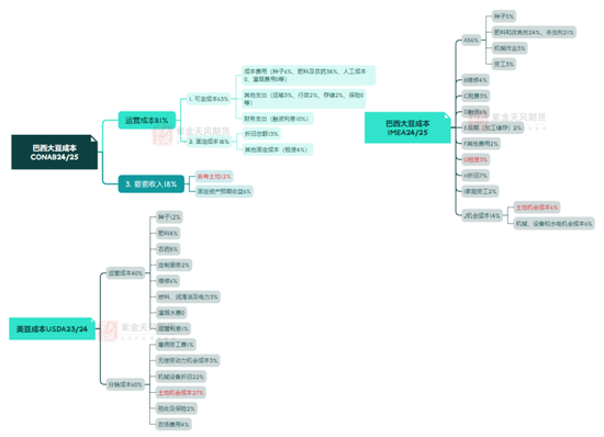• 美国土地成本占比更大:Conab将土地成本划分到“要素收入”部分,占比总成本仅12%,而据IMEA,与土地成本相关的两项为“租赁”与“土地机会成本”,占比总成本也仅9%。而美国大豆种植成本中,土地机会成本占比达到27%。