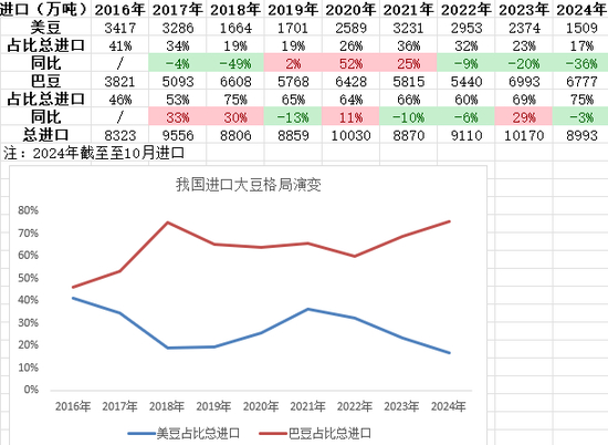 • 24年进口美豆占比较17年砍半。