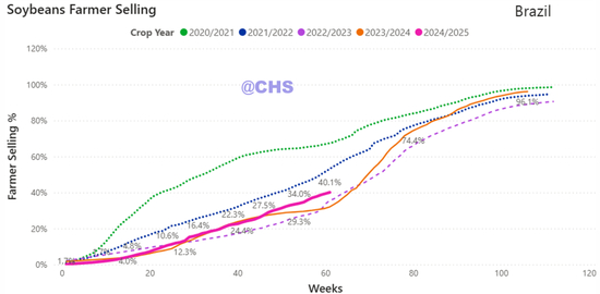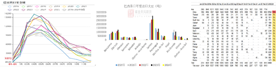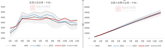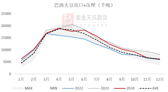 • 24年,巴西累计压榨大豆5024万吨(低于去年同期的5416.5万吨),实际压榨量与全年预估的5540万吨有一些出入。24年累计压榨+出口1.49亿吨,同比减幅4.5%。