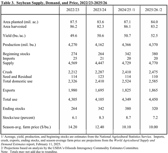 • 农业展望论坛(AOF)由美国农业部(USDA)组织,也是美国农业部历史最悠久、规模最大的年度论坛。论坛会讨论时下流行及新兴的农业话题,如全球贸易、农业创新、动物和作物生物技术的发展以及大宗商品市场等,今年于2.27-28(周四-周五)召开,公布25/26年度的美豆供需形势展望。【大豆】预计2025年美国大豆种植面积为8400万英亩。(路透预期值为8440万英亩,彭博预期值为8440万英亩,2024年最终种植面积为8710万英亩,2024年展望论坛为8750万英亩)【玉米】预计2025年美国玉米种植面积为9400万英亩。(路透预期值为9360万英亩,彭博预期值为9350万英亩,2024年最终种植面积为9060万英亩,2024年展望论坛为9100万英亩)【小麦】预计2025年美国小麦种植面积为4700万英亩。(路透预期值为4670万英亩,彭博预期值为4670万英亩,2024年最终种植面积为4610万英亩,2024年展望论坛为4700万英亩)。