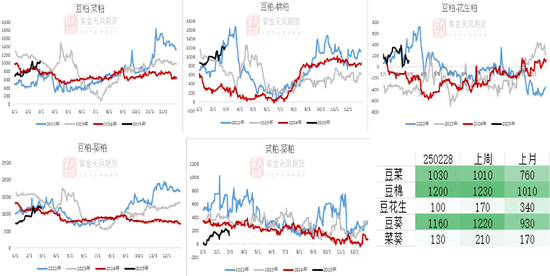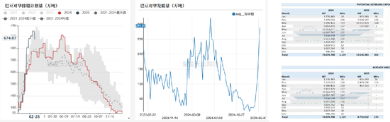 • 25年2月,Abiove对25年日历年度的大豆供给预估为1.75亿吨左右。前期巴西大豆收割慢,今年1月出口较少,为107.3万吨,扣除出口、压榨,我们预估1月理论剩余量同比高出11.5%,2月同比高出10.9%。