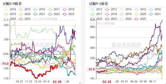 贸易关税政策:从24年下半年以来,作为进口依存度较大的品种,受到中加关系、中美贸易关系等不稳定因素影响,粕类的行情也是动荡不安。11月份,豆粕市场就进行了两次特朗普交易,一次是11月初特朗普当选,美豆短暂的下跌,连粕大涨,市场交易后续贸易摩擦下,中美双方互加关税的预期。25年1月20日特朗普上台前这期间,连粕行情也时常受到特朗普加税言论影响。3.4,我国表示对进口美豆加征10%关税,蛋白跌跌不休,远月支撑更强。
