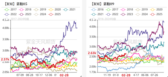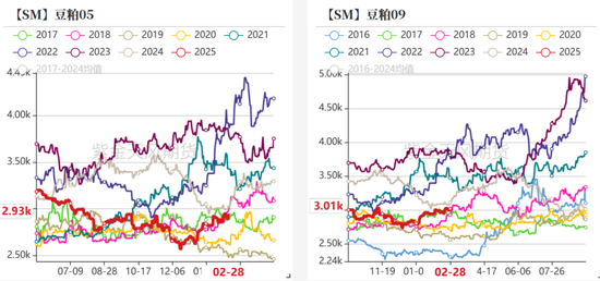 • 2月上旬,现货基差大幅走强。2.1特朗普挥起关税大棒,虽然我国并未对进口美豆加税,但市场做多情绪依旧攀升;年后第二周,油厂大豆压榨量仅几十万吨,加之2月初巴西收获进度偏慢、港口装船慢,近月贴水坚挺,造成节奏上的供应紧缺。