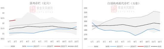 • 截至25年2月,蛋鸡存栏12.31亿只,25年1月,白羽肉鸡祖代存栏212.36万套,处于历年同期较高水平。