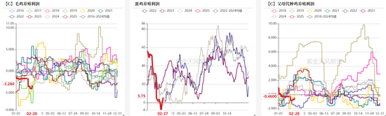 美豆种植面积:美玉米出口需求超预期以及25年1月USDA大幅下调玉米单产,自24年8月起至今年2月,美玉米价格触底回升,美豆美玉米比价利好多种玉米。23年、24年主要化肥价格波动平稳,当前价格处于历年同期中等水平,且据USDA的预估,25/26年种植成本里的化肥成本将下降较多,此外,由于大豆有固氮作用,化肥在玉米种植成本中的占比明显高于大豆。据USDA的披露,23年种植大豆利润高于玉米。以24年、25年的美豆、美玉米05合约价格测算二者利润,我们预估24/25年度大豆玉米种植都是亏损,玉米亏得多,而25/26年度,玉米更明显地缩减亏损。2月底AOF对美豆种植面积的预估符合预期,若后续单产下调,加之关税扰动,则对豆粕远月支撑较强。USDA报告方面,1月定产,2-4月通常不对美豆供需大幅调整。