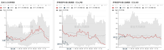 • 美豆、美玉米比价:美玉米出口需求超预期以及25年1月USDA大幅下调玉米单产,自24年8月起至今年2月,美玉米价格触底回升。