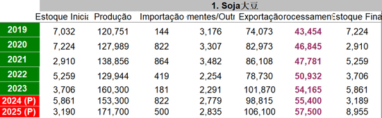 • Conab对24/25季巴西大豆的产量预估为1.66328亿吨(同比增12.6%),进口同比减少44%,消费同比增7%,出口同比增7%,期末库存预估同比增幅112%。