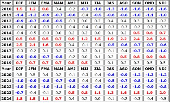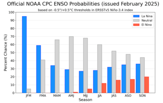 • 当前拉尼娜现象仍在继续,但据NOAA,3月至5月转为中性的可能性为66%,并且从ONI指数可以看出,当前特定区域的海表温度较为温暖,并不符合拉尼娜的海洋温度条件,但当前大气模式符合拉尼娜条件,因此NOAA将当前与近期定义为一个短暂的弱拉尼娜现象。如果一定要对弱拉尼娜现象有一个定义,那就是Niño-3.4指数在-0.5℃和-0.9℃之间并且持续几个月,当前为-0.8℃,连续第二个月超过拉尼娜的阈值。