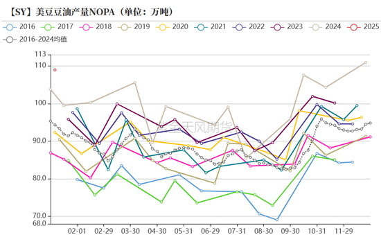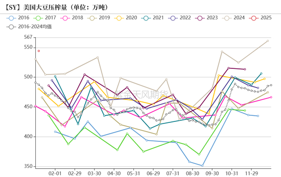 • 25年1月,美豆压榨量544万吨,美豆粕产量432万吨,美豆油产量109万吨。