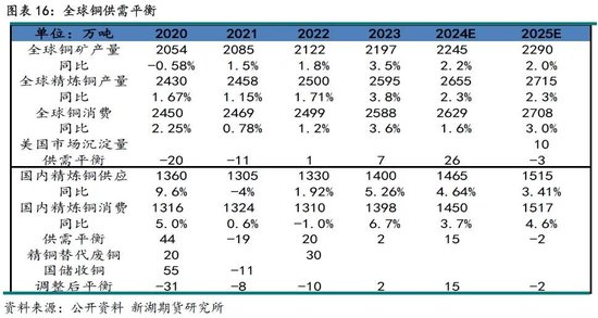 2024年因国内冶炼产量居高不下,以及消费增速下滑,全球铜呈现供应过剩的局面。全球三大市场,SHEF、LME及COMEX库存均累库。2025年全球铜矿供应瓶颈将制约冶炼厂产量释放,精铜供应增速将下降,但需求增幅扩大;再加上关税干扰下,美国铜市场被迫储备的沉淀库存;全球供需有望从过剩转向紧缺,2025年铜基本面整体向好,为铜价提供向上弹性。