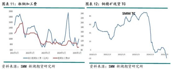 2025年铜精矿加工费长单TC为21.25美元/吨,该数值成为有数据记录以来的最低TC。25年炼厂将迎来艰难期,不考虑副产品,21.25美元的TC对于炼厂来说冶炼1吨将亏损800-1500元/吨。2025年国内炼厂将面临靠硫酸增利的窘境。另外受关税干扰,国内从美国进口废铜量将下降;2024年高铜价也透支了部分国内废铜隐形库存。2025年冷料短缺,偏低的粗铜加工费也将影响炼厂开工。近期铜精矿现货加工费再一次创历史新低,已快速下滑至-14美元/吨的水平。不管是矿端原料还是冷料,25年炼厂都面临较大的压力。其产量释放将具备较大不确定性,全球铜矿增速下降有望在25年传导至冶炼端。