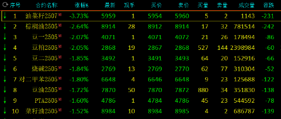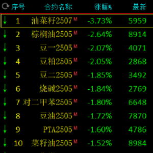 早盘收盘,国内期货主力合约跌多涨少。菜粕涨超7%,集运欧线涨超2%。跌幅方面,油菜籽跌超3%,棕榈油、豆粕、豆一跌超2%,豆二、对二甲苯、烧碱、豆油、PTA菜籽油跌超1.5%。