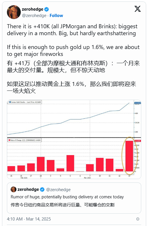 史上首次!黄金期货突破3000美元,盘中现巨量交割!
