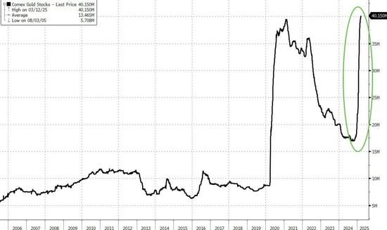 同时,实物黄金市场的混乱局面依然存在,美国黄金进口量激增,尽管黄金租赁费率有所正常化。COMEX金库的流动仍在继续,在过去3个月中,每天都有实物黄金运入COMEX金库,使总量达到创纪录的4015万盎司(1250吨)。