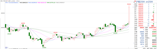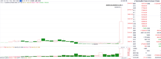 3月14日日盘,沪锡在开盘仅13分钟后迎来涨停收于291,510元/吨;沪锡看涨期权同步大幅上涨。其中,SN2504C300000盘中最高触及6666元/张,上涨3333倍。