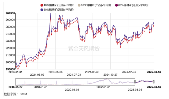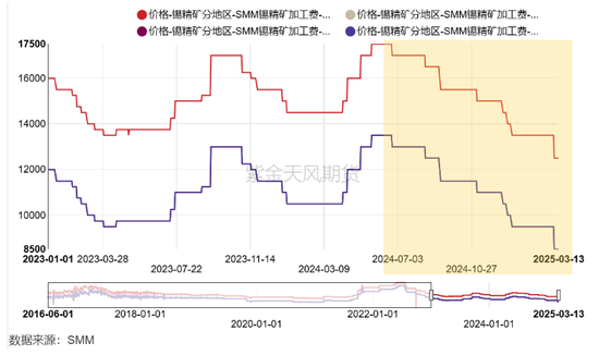 2024年6月末以来,国内锡精矿加工费持续下滑。截至2025年3月14日,云南地区40%锡精矿加工费下滑至12500元/吨,较2024年6月最高点下跌28.57%;湖南、江西、广西60%锡精矿加工费均下滑至8500元/吨,较2024年6月最高点下跌37.04%。
