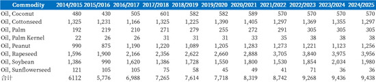 自2014/2015年至今八大油脂合计产量增幅330万吨,比例达到54.4%,其中印度产量相对较小的油脂椰子油、棕榈油、棕榈仁油和葵花籽油并不会大幅影响供给端,主要的增量来自于菜油,从160万吨产量增长至396万吨,并且豆油和花生油均有明显的增长趋势。