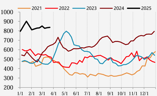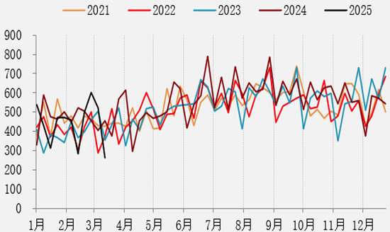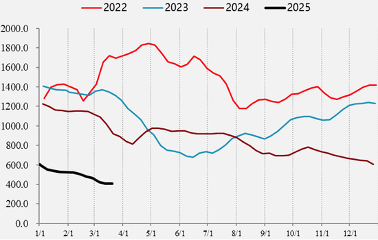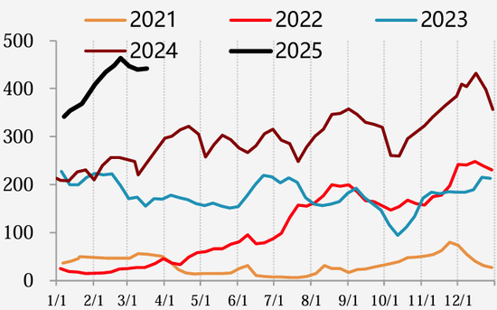 此前,随着锰硅价格反弹至7000元/吨以上,期现商和合金厂套保较多,产区预定的仓单量达到相对偏高水平。盘面快速下跌后,主力合约最低触及6050元/吨,产地仓单基差由贴水近500元/吨,收敛至贴水330元/吨,低价成交好转,产区仓单资源开始逐步消化。截至3月21日,锰硅注册仓单量57.42万吨(同比增242%),若价格维持低位,交割库仓单也将缓慢消化,05合约仓单压力相较之前显著缓解。