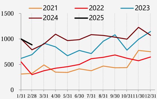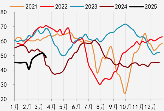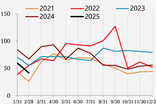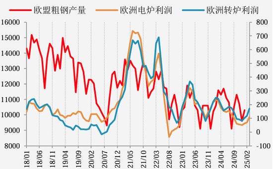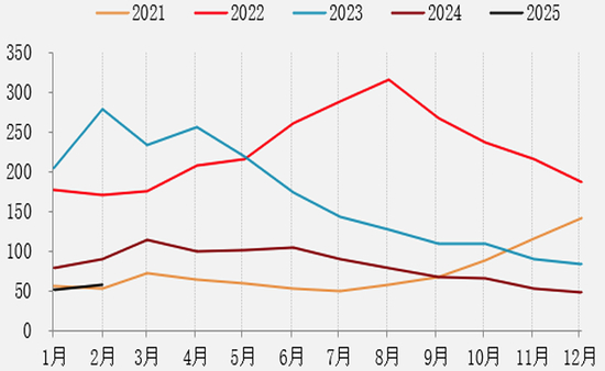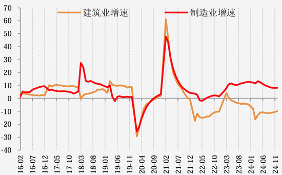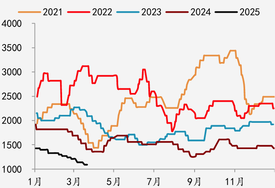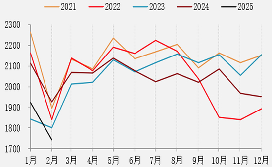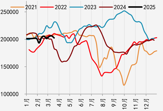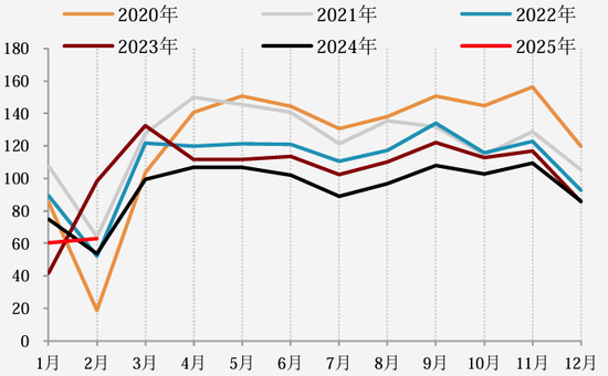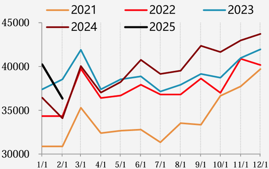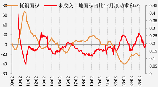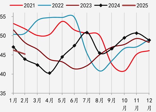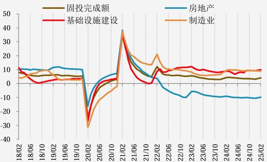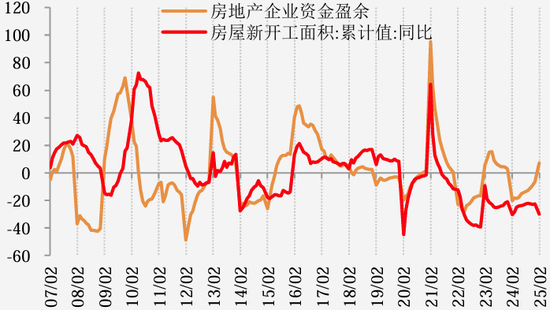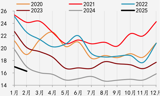 2024年需求周期下行主要受建筑需求拖累,2025年1-2月建筑端表现仍未见改善。具体来看,房地产开发投资累计同比下降9.8%,商品房销售面积同比下降20.5%,施工面积同比下降5.1%,新开工面积同比大幅收缩29.6%。