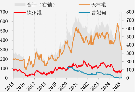 受短期供给扰动和复产影响,铁矿石库存出现较为明显的去库。当前47港铁矿石库存总量14914万吨,较年初减少696万吨,比2024年同期增加1万吨;247家钢厂进口铁矿石库存9124万吨,较年初减少734万吨,比2024年同期库存减少269万吨。