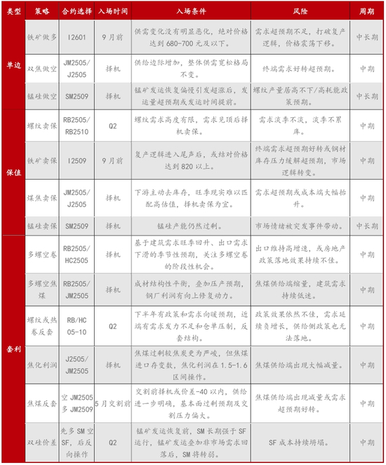 单边方面,锰硅成本缓慢下移,低库存与钢厂补库提供阶段性支撑,矛盾不大。主要交易点集中在锰矿和化工焦引发的成本变动,主要关注5月中旬澳块能否顺利恢复发运,但锰矿发运回升已经被提前交易,反而需要警惕锰矿发运恢复不及预期。综合考虑成本支撑和合金厂套保预期,二季度主力合约主运行区间5850-6550元/吨。但考虑成本端6月以后预期出现松动,同时非市场需求同步下降,若有超涨,可以考虑配置09合约空单。硅铁继续震荡磨底,贴近成本、高能耗、低仓单量,价格容易受到市场情绪影响,政策可能放大波动,做空风险较大,需灵活把握超跌反弹机会。硅铁电费下调幅度和双碳政策是主要关注点。