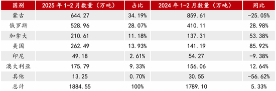 2025年1-2月,我国炼焦煤进口量1884.55万吨,同比微增5.33%,进口集中度维持高位,蒙古、俄罗斯、加拿大、美国及印尼、澳大利亚五国占比达99.3%。